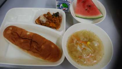 *今日の献立は「おさつパン、牛乳、かぼちゃのミートグラタン、スープ、すいか」でした。