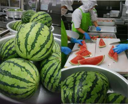 今日の給食では、鳥取県産の大玉のものが中学校2校分で25玉、届けられました。すいかの甘いところは中心部なので、甘さ・大きさ・形がほぼ同じになるよう「秘伝の技」で1玉を64個に切り分けました。