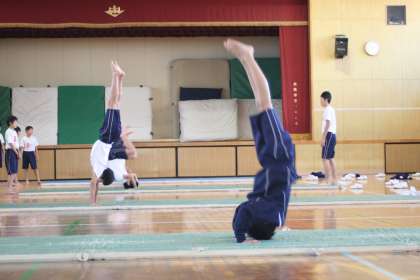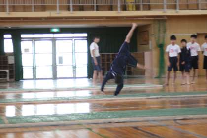 寒さが厳しくなっても子どもたちは元気いっぱいです。2年生体育の授業にて、体育館では男子生徒がマット運動に打ち込んでいました。倒立前転や開脚後転など、体操部の部員が手本を務めると、周囲の生徒から拍手が起こっていました。さすが日々練習を積んでいるだけあって、体操部の生徒は光って見えます。まだ慣れない生徒も、背中を打ちつけながら一生懸命取り組んでいました。
