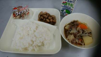 今日の献立は「肉じゃが、とら豆の煮もの、アーモンドフィッシュ、ごはん、牛乳」でした。