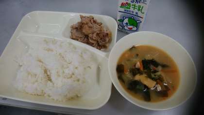 今日の献立は「ごはん、豚肉のしょうが焼き、みそ汁、牛乳」でした。