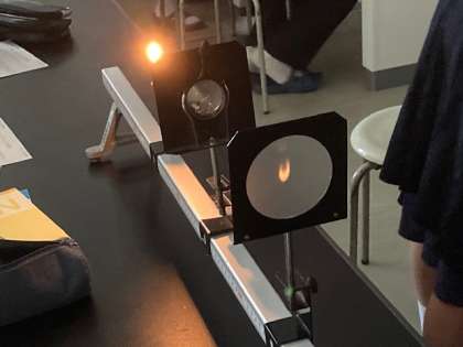 凸レンズでできる実像と虚像の実験です。 逆さに写っています。