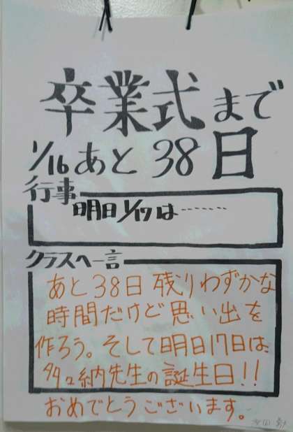 この3年間ににたくさんの反省をし、目標を決め、達成してきたことでしょう。受験を目前に控えている3年生の最後の目標は、どのクラスも「最後に向けて勉強をしっかりしよう。」ということを決めていました。残り少ない時間、勉強も学校生活も後悔しないよう、過ごしてほしいと思います。