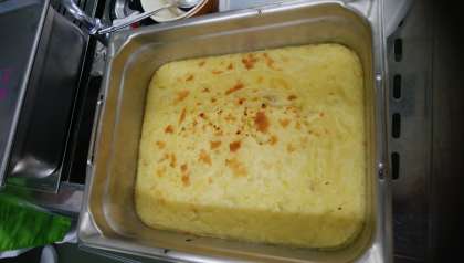さつまいもの旬は秋で、9月〜11月頃に多くとれます。今日の給食では、徳島県産の「鳴門金時」を約70kg(2校分)使い「スイートポテト」を作りました。スイートポテトは日本発祥の洋菓子です。給食では裏ごしができないので、とろとろになるまで40分間ほどかけて柔らかく煮ました。砂糖、バター、牛乳、クリームを加え、まろやかさとこくを出しています。最後に焼き物機でこんがりと焼き色をつけました。
