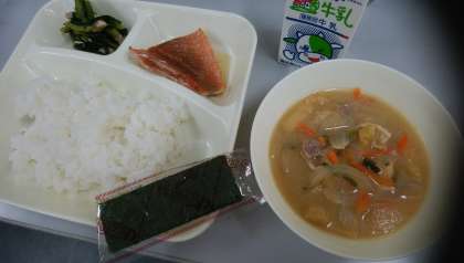 今日の献立は、「ごはん、赤魚のしょうゆだれかけ、みそ汁、小松菜のいためもの、牛乳」でした。