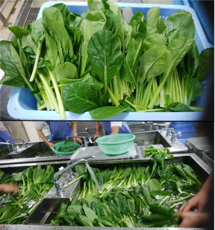 今日、緑中学校の給食室では、福岡県産の小松菜を65kg使いました。