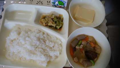 今日の献立は「ごはん、牛乳、卵どうふ、鶏肉と一口がんもの煮もの、野菜のそぼろいため」でした。
