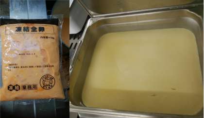 給食では、鶏卵(液卵)、けずりぶしからとっただし汁、みりん、塩、うす口しょうゆを合わせてクラスごとのバットに流し入れ、スチームコンベクションオーブンで30分間蒸しました。