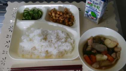 今日の献立は「ごはん、鶏肉と野菜の煮もの、じゃこ豆、あっさりきゅうり、牛乳」でした。