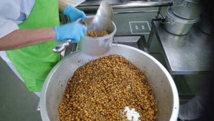 朝から熱湯につけて柔らかくした乾燥大豆にでんぷんをまぶして油で揚げたものと、ちりめんじゃこ、白ごまを合わせ、砂糖・こい口しょうゆで甘辛く味付けした人気メニューです。やや噛み応えがあり、大豆のおいしさが味わえる一品です。