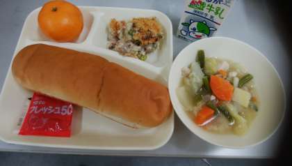 今日の献立は「コッペパン、いちごジャム、牛乳、鶏肉とじゃがいものスープ煮、きのこのドリア、みかん」でした。