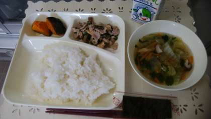今日の献立は「ごはん、豚肉と干しずいきのみそ煮、すまし汁、焼きかぼちゃの甘みつかけ、焼きのり、牛乳」でした。