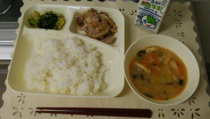 今日の献立は「ごはん、豚肉のしょうが焼き、さつまいものみそ汁、きくなとはくさいのごまあえ、牛乳」でした。