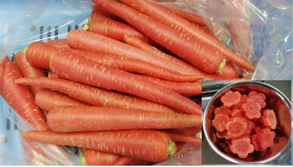 給食では1年に1回、正月の行事献立にのみ使用しています。江戸時代から昭和初期にかけて、大阪市浪速区付近の特産として「大阪人参」や「木津にんじん」と呼ばれていました。長さは約30cmで色は深紅色、肉質は柔らかく甘みと香りが強いのが特色です。関西では、正月料理には欠かせないものとなっています。