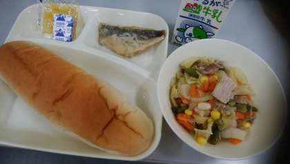 今日の献立は「あじのレモンマリネ、てぼ豆のスープ煮、固形チーズ、コッペパン、マーマレード、牛乳」でした。