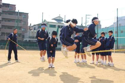 2年生の取り組みで大縄跳びを行っていました。しかし、いつもとルールが違うようです。縄を飛ぶうちの半数の生徒は目隠しをしています。目を隠した人と、掛け声でジャンプのタイミングを伝えながら飛ぶ人に分かれて大縄飛びが行われていました。