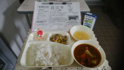 給食では通常も国産牛肉を使っていますが、近江牛を使ったカレーライスはつやよく、濃厚な味わいに仕上がりました。給食前には「今日の近江牛を楽しみにしてました!」、給食後には「おいしかったです!」という声が多く聞かれました。