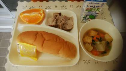 今日の献立は「コッペパン、アプリコットジャム、豚肉のオイスターソース焼き、あつあげと大根の中華煮、デコポン、牛乳」でした。