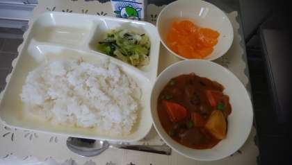 今日の献立は「ハヤシライス、キャベツのひじきドレッシング、みかん(缶詰)、牛乳」でした。