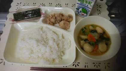 今日の献立は「ごはん、鶏肉のからあげ、まる天と野菜のうま煮、焼きのり、牛乳」でした。