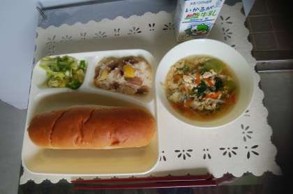 今日の献立は「黒糖パン、中華おこわ、卵スープ、キャベツとピーマンのいためもの、牛乳」でした。