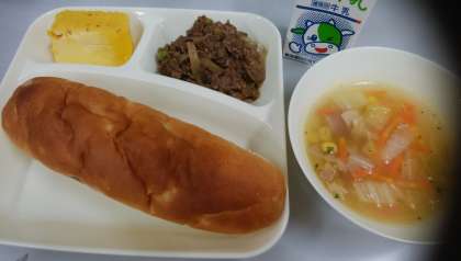今日の献立は「おさつパン、牛肉のデミグラスソース煮、コーンとはくさいのスープ、かぼちゃのプリン、牛乳」でした。