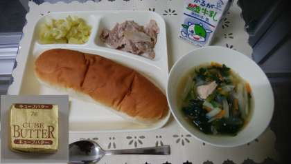 今日の献立は「コッペパン、バター、豚肉のガーリック焼き、スープ、サワーソテー、牛乳」でした。