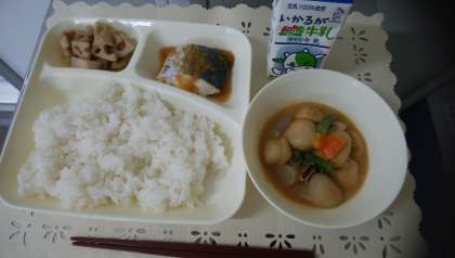 今日の献立は「ごはん、さごしのおろしじょうゆかけ、一口がんもとさといものみそ煮、れんこんのいためもの、牛乳」でした。