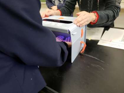 感染症予防での手洗いの必要性を再確認することを目的に、手洗いチェッカーという器具を使って、日頃の自分達の手洗いが十分にできているか、洗い残っている部分があるのかどうかをチェックしました。