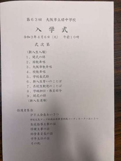 4月6日 第63回 大阪市立緑中学校 入学式