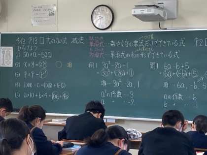 4月13日 2年生 数学 公開日 2021/04/13 更新日 2021/04/13 学校行事 2年生の数学の授業です。 式の加法、減法です。 単項式、多項式を理解して、自由自在に数式を扱ってください。 いいね(0)