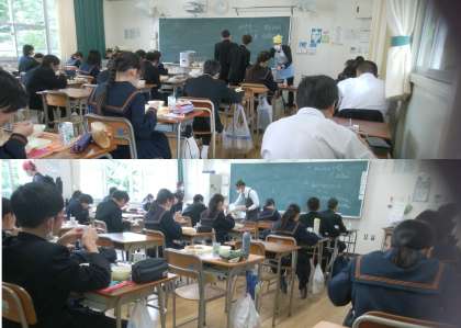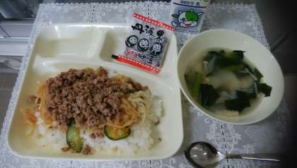 今日の給食では、牛・豚ひき肉をいため、コチジャンなどで甘辛く味つけしたものと、きゅうり、にんじん、切り干しだいこんを具材にし、ごま油などで風味を出したナムルをごはんの上に盛り付けていただきました。