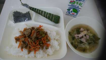 今日の給食は、5月5日のこどもの日にちなんだ行事献立「きんぴらちらし、すまし汁、ちまき、牛乳」でした。日本に昔から伝わる行事食を子どもたちにもしっかりと伝えていきたいというねらいで「こどもの日の行事献立」にちまきを使用したのは1986年からで、今年で36回目となります。