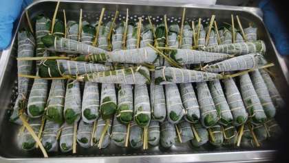 給食のちまきは、試作を重ねて配合割合を考えた大阪市のオリジナルで、冷凍で届いたものを給食室で蒸しました。(2枚目の写真)
