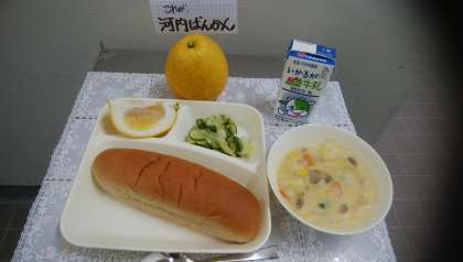 今日の献立は「黒糖パン、コーンクリームシチュー、キャベツときゅうりのサラダ、かわちばんかん、牛乳」でした。