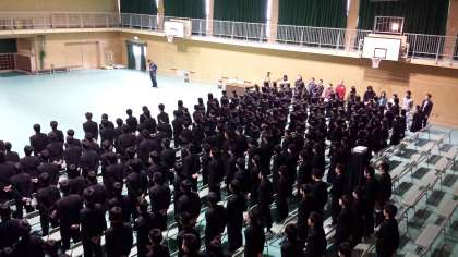 明日の卒業式に備え、3年生は本番を想定した予行練習を行いました。予行には在校生や吹奏楽部、教職員も参加し、本番さながらの緊張した雰囲気のなかで行われました。