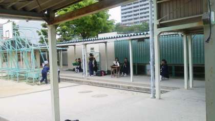 渡り廊下で、パートに別れて練習をしています。みんな一生懸命にやっています。