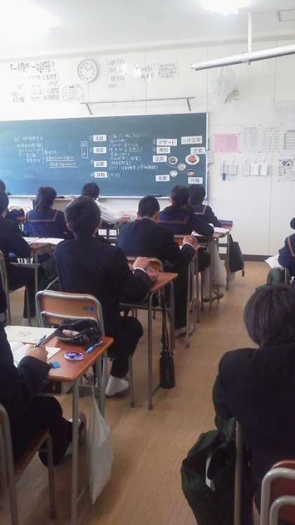 2年4組は、家庭科の授業を行っていました。主食・副食など、料理の勉強していました。