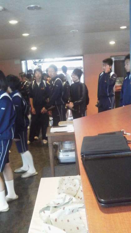 朝食場所(四季膳)前に、集まる生徒たち、入り口で保健係りが、健康観察の用紙を回収しています。