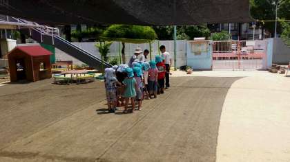 こちらの幼稚園では園児たちとリレー競争の練習が行われていました。