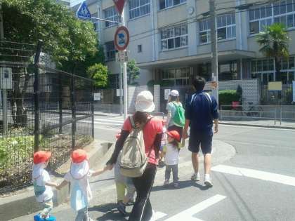 今日は天気が良いので気温が高く、園児たちの体調も気にしながらの散歩です。