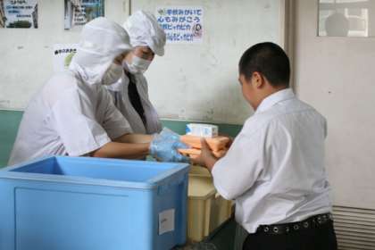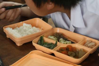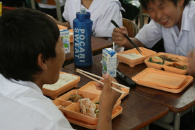 9/3から給食が開始されました。各学年のフロアでは、配膳員の方によって手渡しで生徒に給食を配膳しています。教室では、お弁当を持参している生徒、給食を注文している生徒が一緒になり楽しそうに食事をしています。さて、今日の献立は何でしょうか。給食の献立は、生徒の関心事の一つになっています。