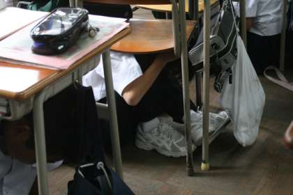 3時間目の授業中に「大阪府近郊にて地震が発生しました」というアナウンスが各教室に鳴り響きました。放送を聞いた生徒は、速やかに机の下にもぐりました。本日は、大阪880万人訓練の実施日です。府民が、色々な情報源から地震発生情報を認識し、地震発生時に行動できるようにすることを目的とした訓練でした。各クラス、先生方の指示のもと、迅速な行動が見られました。