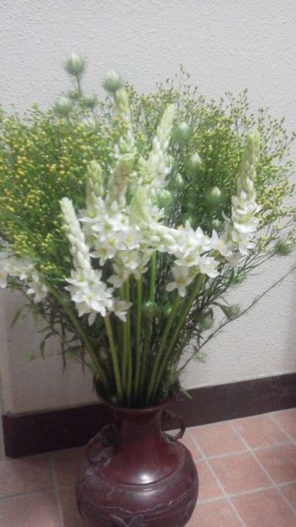 事務室の前に白色・黄色・水色の花が活けて有りました。