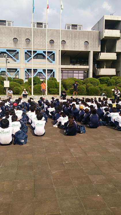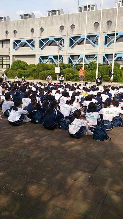 暑さの中、オリエンテーリングが終了しました。今、水分補給がすんだところです。