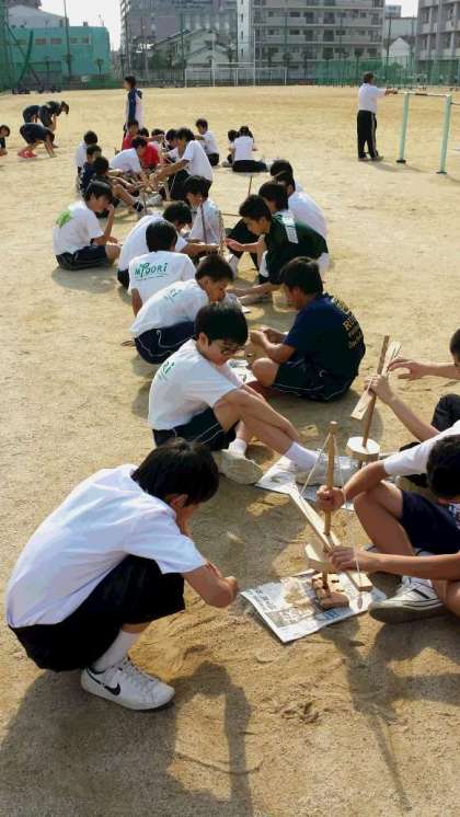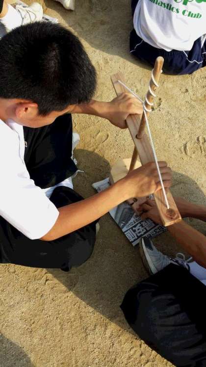 この2年生の野外炊事では、マッチやライターは使いません。火の有り難みを感じるために、先生たちが木で作った道具を使って火をおこします。今日の放課後から火おこしの練習も始まりました。火をつけることはなかなか難しく、今日、火をつけることができた班はたった一つの班だけでした。