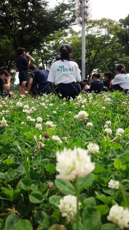 集合場所の大芝生はクローバーとシロツメクサのじゅうたんのよう。学校のすぐ近くにこんな場所があるのはとてもありがたいです。