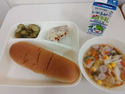 今日の献立は「黒糖パン、かつおのマリネ焼き〔ノンエッグドレッシング〕、ウインナーとじゃがいものスープ、きゅうりのサラダ、牛乳」でした。
