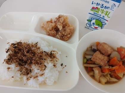 今日の献立は「ごはん、鶏肉のたつたあげ、あつあげと野菜の煮もの、おかかなっ葉、牛乳」でした。