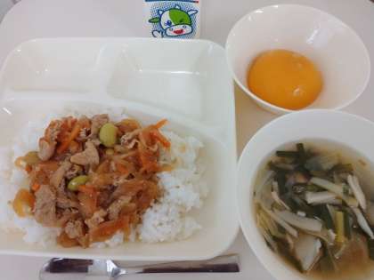今日の献立は「ピリ辛丼、中華スープ、黄桃(缶)、牛乳」でした。
